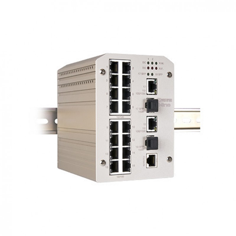 The MDI-118-F2G is an 18-port managed Ethernet switch with a flexible port setup including 7 10/100BaseTX ports and 2 10/100/1000 RJ-45/100-FX/Gigabit SX/LX combo ports. The MDI-118-F2G is equipped with advanced ring technology supporting multiple rings, dual homing rings, and RSTP, as well as a wide range of Layer 2 network features for complex networks such as VLAN, QoS, IGMP Snooping, Port Trunking, etc.